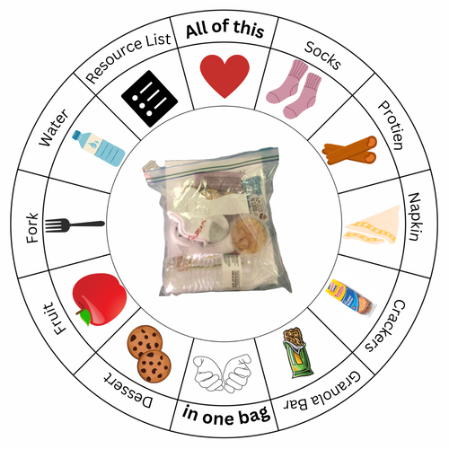 All of the supplies that go into the bags are all donated by people and the bags are assembled by volunteers. We have Manna Bag making nights where only temple members make bags. We also have Nights of service and learning where members from Grace Presbyterian Church, Temple Solel, and other religious organizations come together to make bags and have a discussion about an aspect of faith.